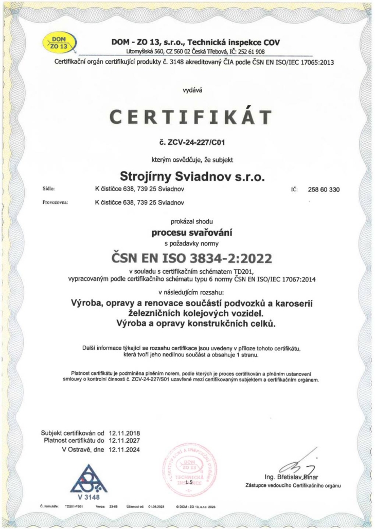 Jsme certifikováni pro výrobu kolejových vozidel u Českých Drah, Deutsche Bahn a dalších evropských provozovatelů.